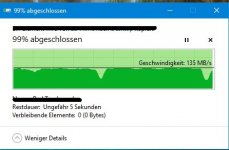 Das lustige ist ja eben auch das das Kopieren auf den PC (was ja Lesen etspricht, in der Regel so mit 110 und 140 MB/s läuft) langsamer ist das Kopieren aufs Nas (was ja Schreiben entspricht, denn das läuft so mit 170 - 220 MB/s)