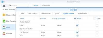 @synfor Der User hat Lese und Schreibrechte auf den "Scan" Gemeinsamen Ordner und FTP Zulassen in den Anwendungen