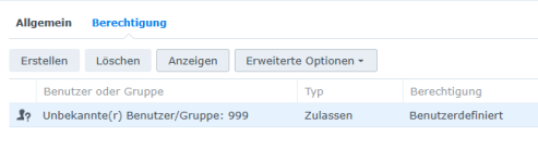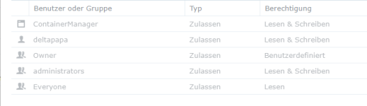 Jetzt habe ich aber bemerkt, dass bei den beiden Ordnern Medien und Export, ein Besitzer User "1000" und unter Berechtigung eine Gruppe "Unbekannte(r) Benutzer/Gruppe: 1000", mit allen Rechten vorhanden sind - und alles ist ausgegraut - heißt, die Rechte sind übernommene Berechtigungen. (Von Docker/Portainer?)
