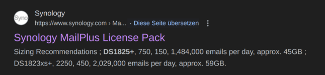 insofern hat man zumindest für die maximale RAM Bestückung eine halbwegs verlässliche Info (wenn auch recht unspektakulär). Zum Mail Plus Licence Pack findet man im Google CacheDS1825+, 32 GB (16 GB x 2), 8. DS1823xs+, 32 GB (16 GB x 2), 8. DS1821+, 32 GB (16 GB x 2), 8. DS1621+, 32 GB (16 GB x 2), 8. DS1522+, 32 GB (16 GB x 2), 4.