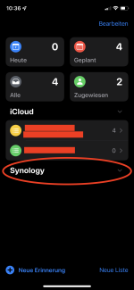 Ich sehe in der macOS "Erinnerungen-App" den neuen Bereich "Synology" mit der Kategorie "Inbox".