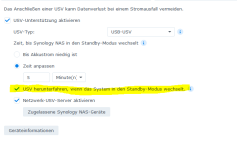 meine DS 920+ leistet treue Dienste und hat von mir vor einiger Zeit eine USV spendiert bekommen. Eine CPS UT850EG. Diese wird auch brav erkannt und soll nach 10 Minuten in den Standby-Modus fahren. Aber wieso Standby? Sollte er nicht runterfahren? Die Auswahl gibt es aber nicht.
