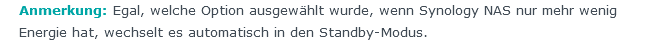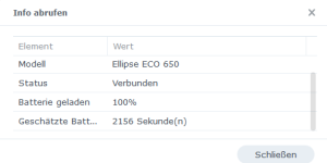 Bei den Geräteinformationen der USV in DSM erscheint bei Batterieladung immer 100% und bei geschätzter Batteriezeit "nicht verfügbar". Also schließe ich daraus, dass die USV nicht vollständig kompatibel ist. Deshalb habe ich auch 10 Minuten gewählt und nicht "Bis Akkustrom niedrig ist".