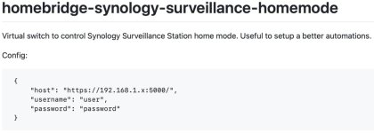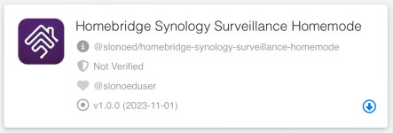 Ich habe dies mittlerweile (wieder) mit einer Aktionsregel > Ereignis > Ereignisquelle (Webhook / Externe Quelle) in Surveillance Station und diesem Plugin erledigt. Das Plugin erzeugt einfach einen virtuellen Schalter (Ein/Aus), den ich in Homekit für Automationen nutzen kann. Es braucht zwei Aktionsregeln in Surveillance Station (HomeMode an/HomeMode aus) - daraus ergeben sich zwei URLs die der virtuelle Schalter in HomeBridge ansteuern kann.