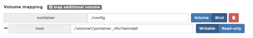 5. Ich gehe in den jeweiligen Container (in diesem Fall "heimdall"), unter der Option "Volumes" und versuche, das neu erstellte Volume zu nutzen: