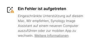 Eingeschränkte Unterstützung auf diesem Mac. Wir empfehlen, Synology Image Assistant auf einem neueren Computer auszuführen oder zur mobilen App zu wechseln. Weitere Informationen