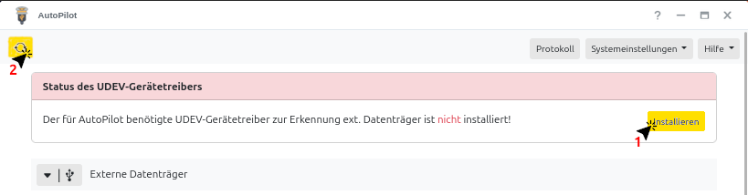 - Damit AutoPilot externe Datenträger erkennen kann, nachdem sie an das Synology NAS angeschlossen wurden, muss ein Gerätetreiber in Form eines kleines Script installiert werden, das sich an die bereits vorhandene permanente Überwachung der USB- und eSATA-Anschlüsse durch den DSM anhängt und Informationen an AutoPilot sendet, sobald ein externer Datenträger angeschlossen wird. Um den Gerätetreiber zu installieren, klicke bitte auf die Schaltfläche Installieren (1)