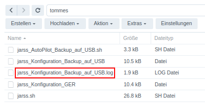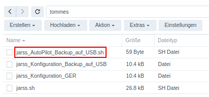 - Folge im Anschluss daran den beiden Anleitungen AutoPilot herunterladen, installieren und einrichten und Einen externen Datenträger an AutoPilot binden. Im folgenden Beispiel wird als Dateiname des Shell-Skripts der Name jarss_AutoPilot_Backup_auf_USB.sh verwendet und am selben Speicherort abgelegt, an dem sich bereits die jarss-Dateien befinden.