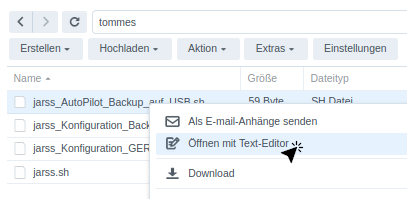 - Öffne die File Station und wechsle in das Verzeichnis, in dem sich das soeben erstellte Shell-Skript jarss_AutoPilot_Backup_auf_USB.sh befindet. Klicke mit der rechten Maustaste auf diese Datei und wähle aus dem sich öffnenden Kontextmenü den Punkt "Öffnen mit Text-Editor" aus.