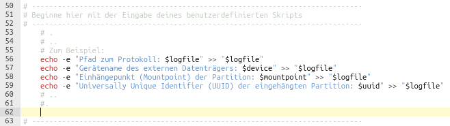 - Du wirst jetzt mit einem teilweise unverständlichen Text konfrontiert, den du aber nicht weiter beachten musst. Wichtig ist der Bereich zwischen Zeile 53 und 61, da dieser für Benutzereingaben vorgesehen ist, wobei sich in den Zeilen 56 bis 59 bereits einige Beispieleinträge befinden. Diese können bedenkenlos übernommen werden. Bewege den Cursor zum Ende der Zeile 61 und drücke die Eingabetaste, um in eine neue Zeile zu springen. Du solltest dich nun in Zeile 62 befinden.