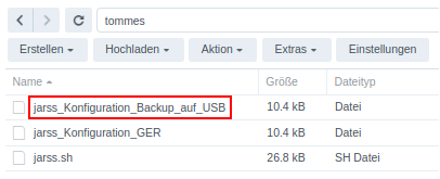 - Folge zunächst den beiden Anleitungen jarss herunterladen und jarss einrichten. Im folgenden Beispiel wird eine Konfigurationsdatei mit dem Namen jarss_Konfiguration_Backup_auf_USB verwendet.
