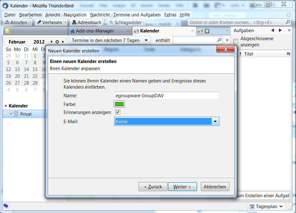 Im folgenden Fenster CalDAV auswählen und als Adresse angeben: