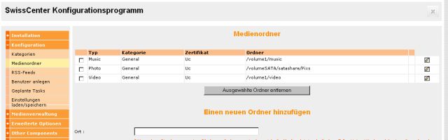Damit Swisscenter überhaupt weiß, wo es nach Mediendateien suchen soll, müssen die Medienverzeichnisse hinzugefügt werden. Dazu unter Konfiguration den Unterpunkt Medienordner wählen und die benötigten Angaben machen. Folgende Angaben sind zwingend: